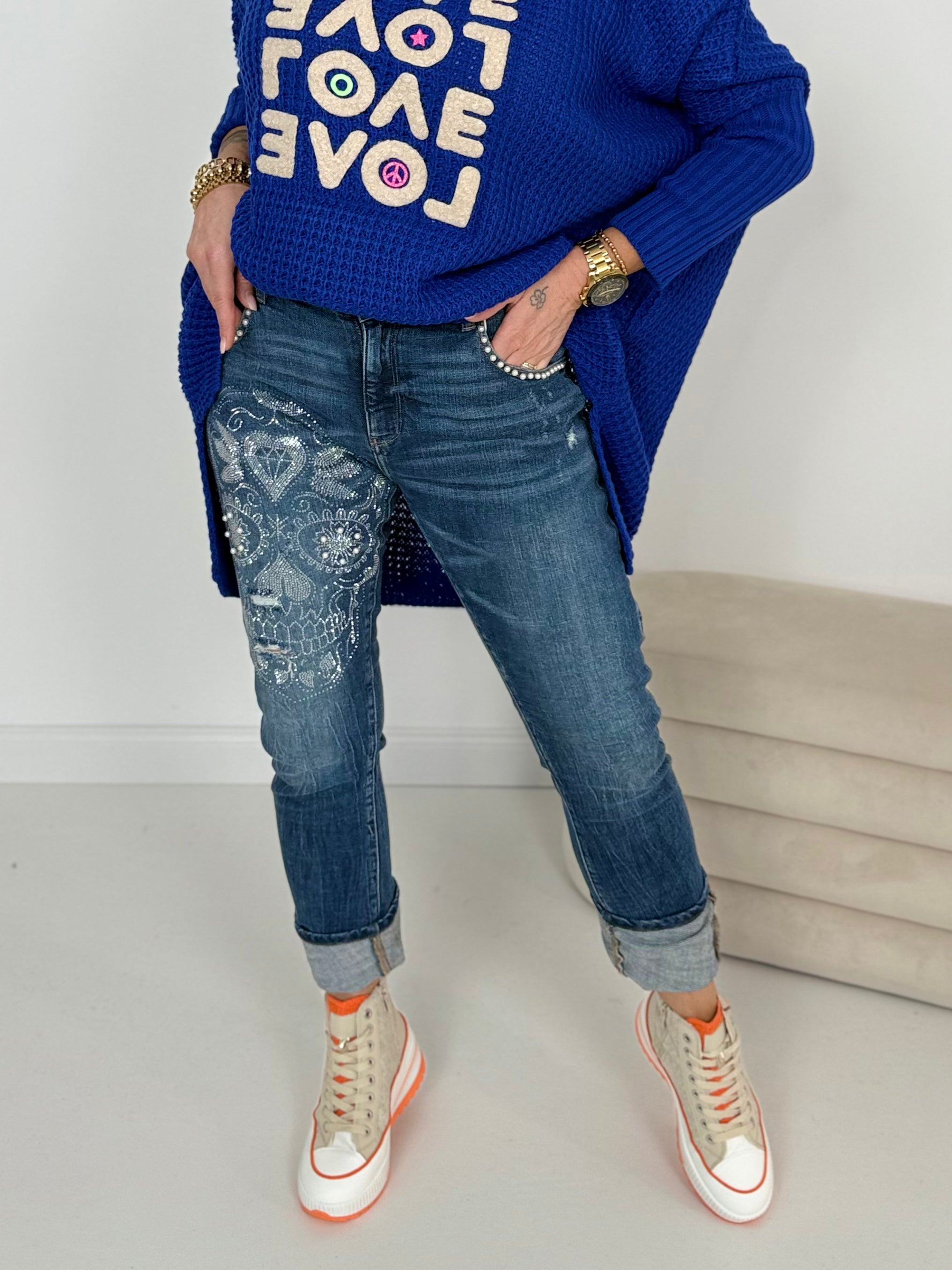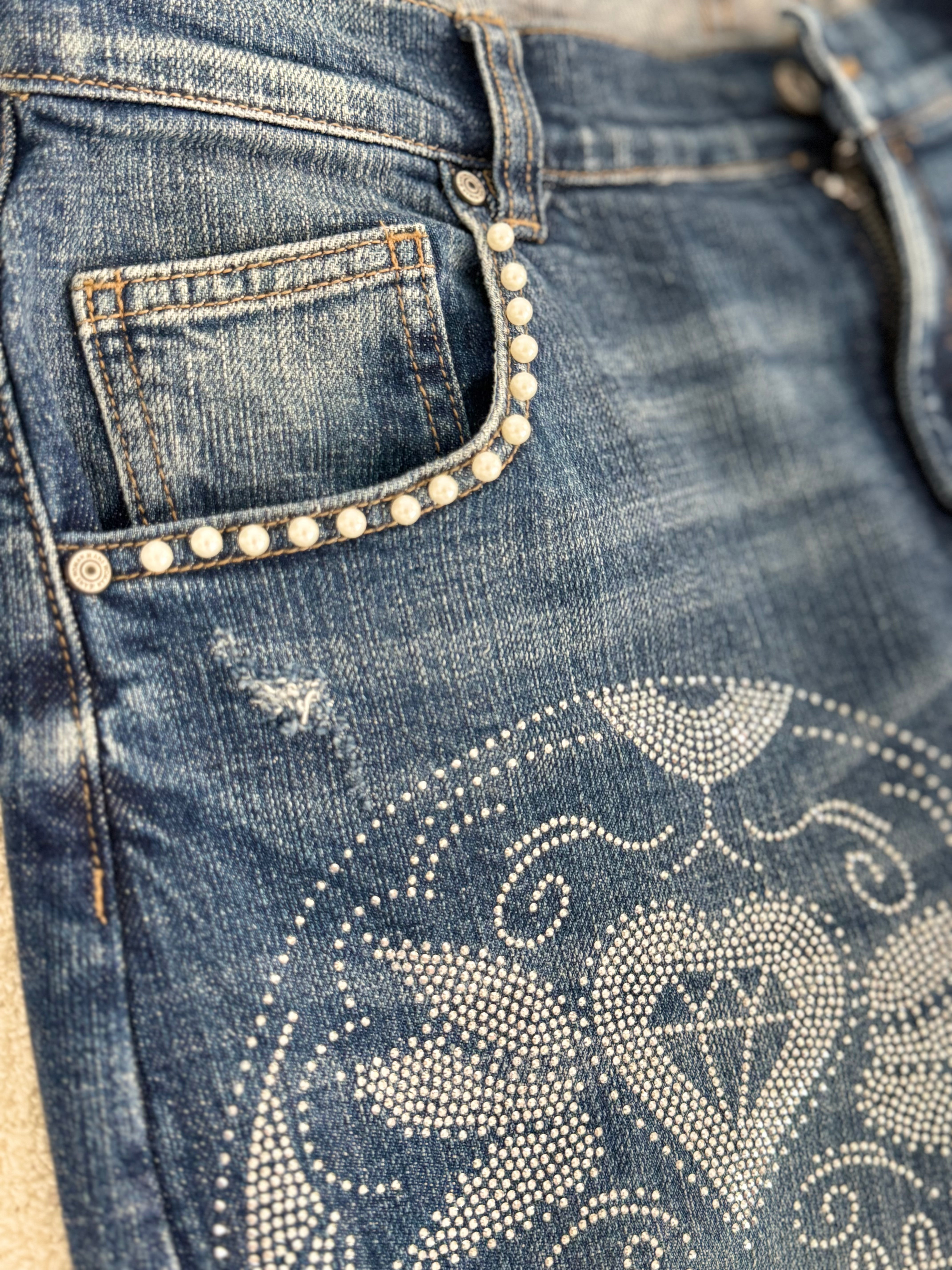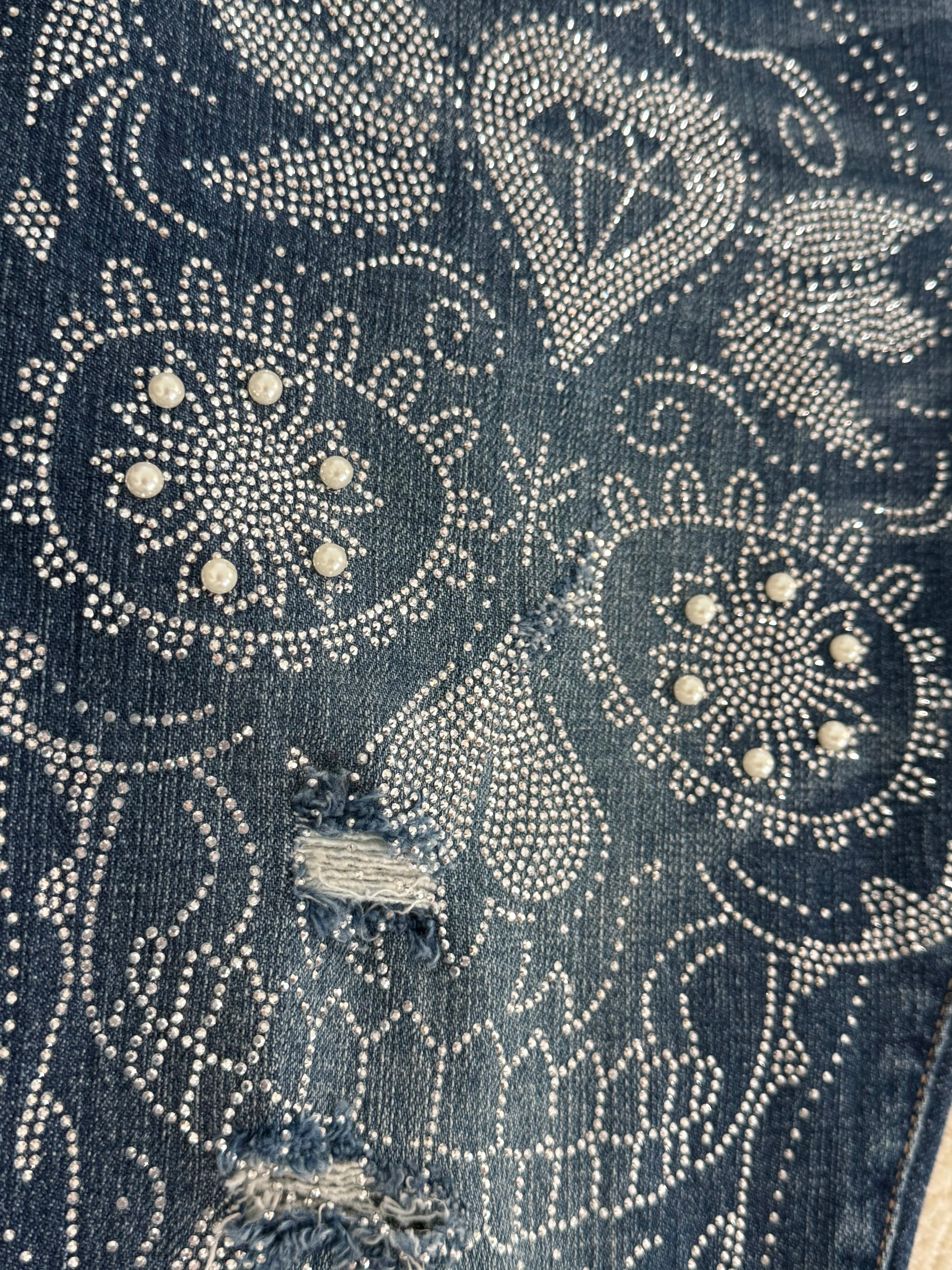 Vorne Motiv mit silber glänzenden Steinchen & Perlen
